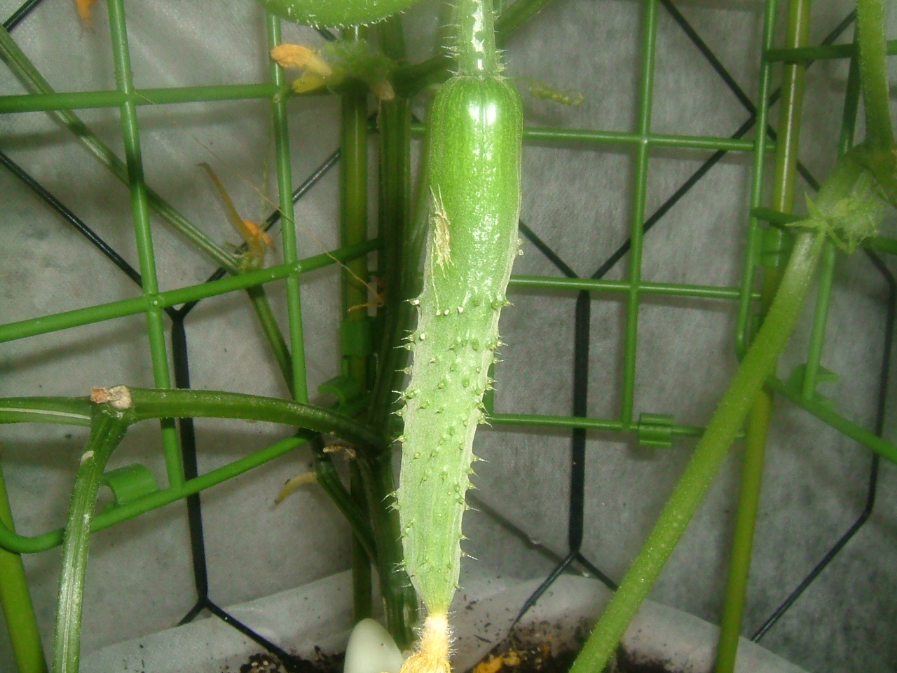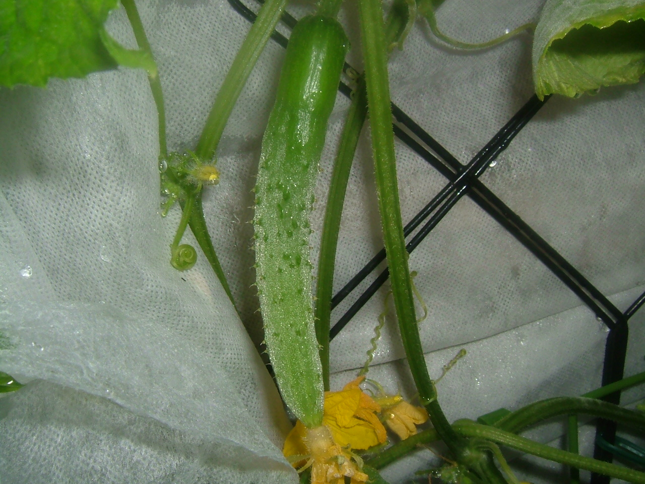 きゅうりの伸長は165cmぐらいですか・・もうあんまし伸ばさないようにしてますので先端に雌花が無かったら、摘心してます。