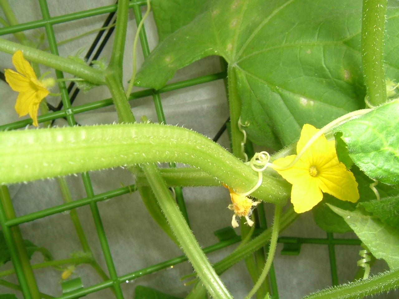 雌花が出る方法・・・おばちゃんは運って言ってましたが、調べてみると最初に7枚葉ぐらいに摘心するそうです。私の場合は1mぐらい伸びてて、雄花ばっか咲いてましたのでおばさんに聞いたら(つるは伸び放題はだめ)摘心したほうが良いとの事。そして4日後ぐらいでしょうか?雌花のヒョロっとしたのがでてきたよ~。