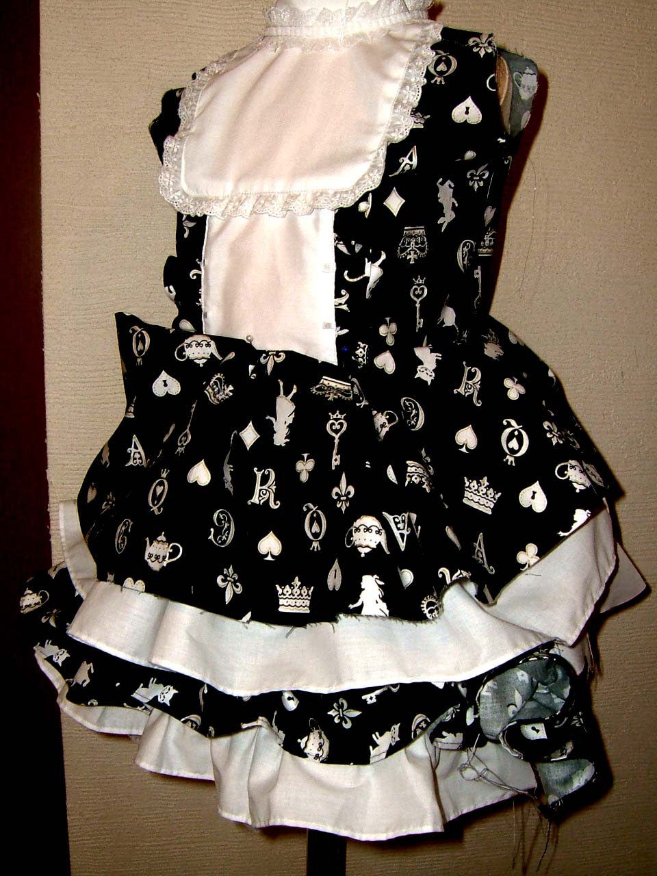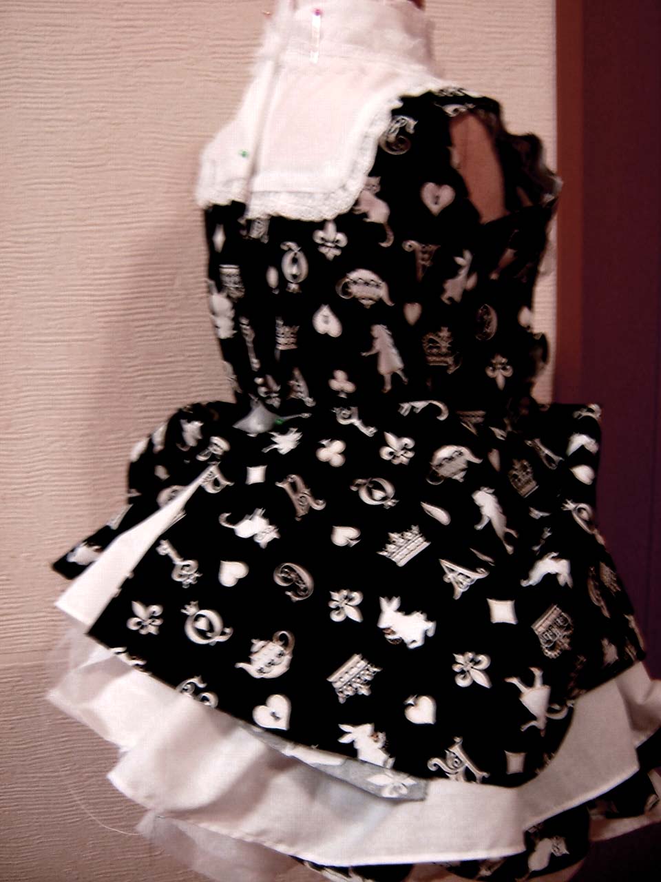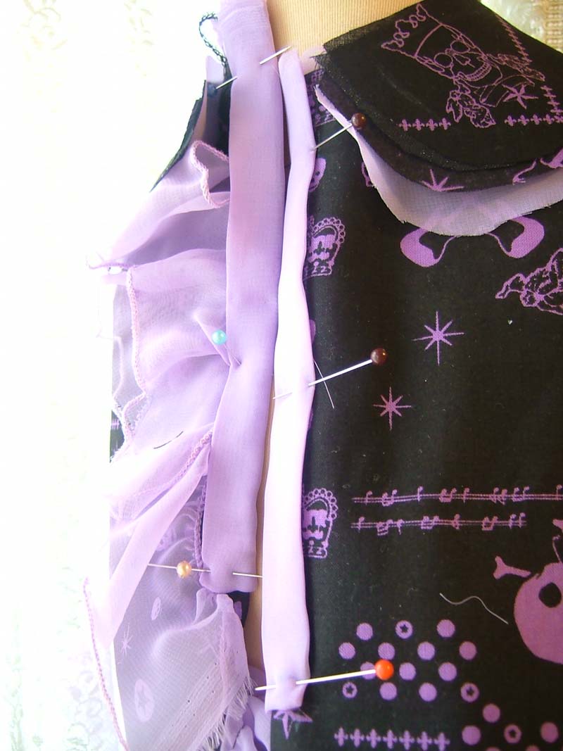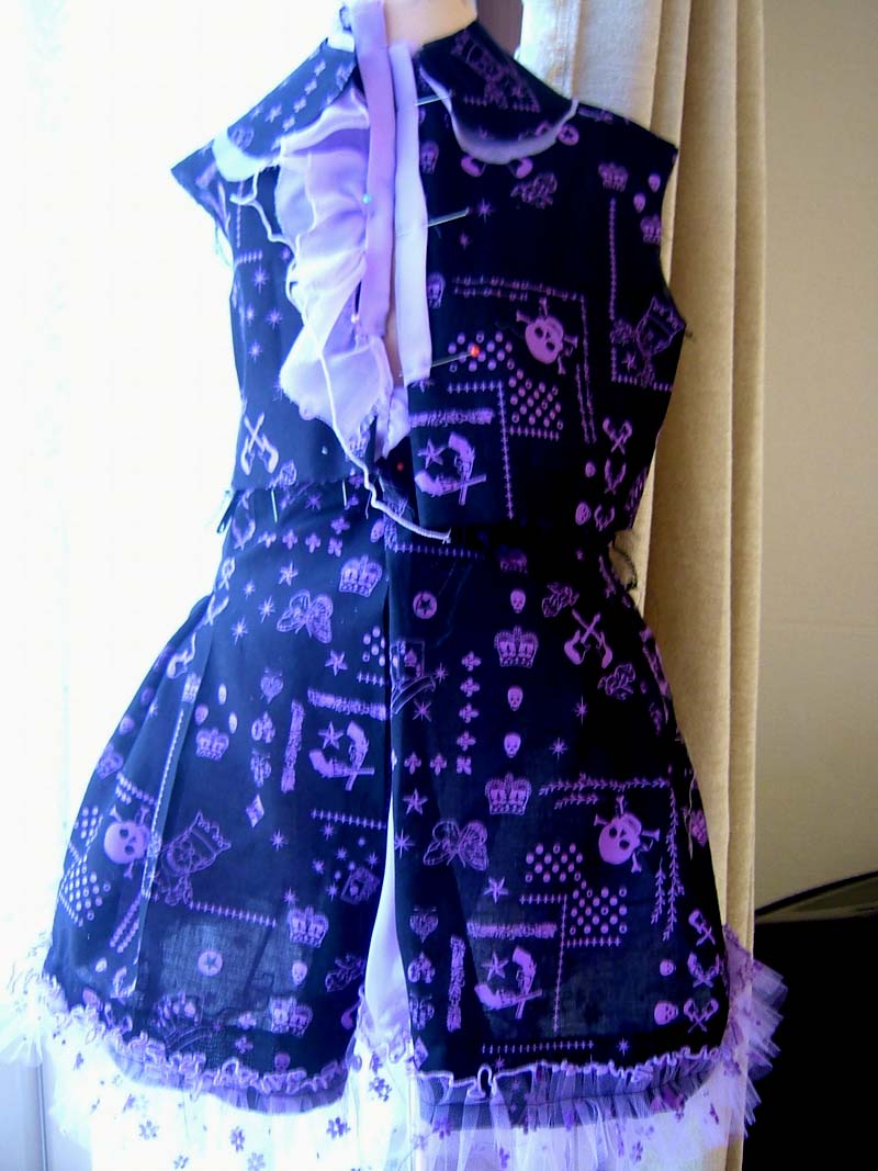 今、スカートのフリルを作ってます。デザインはオリジナルです。と言っても、今まで作ってきた服を応用できるように色々