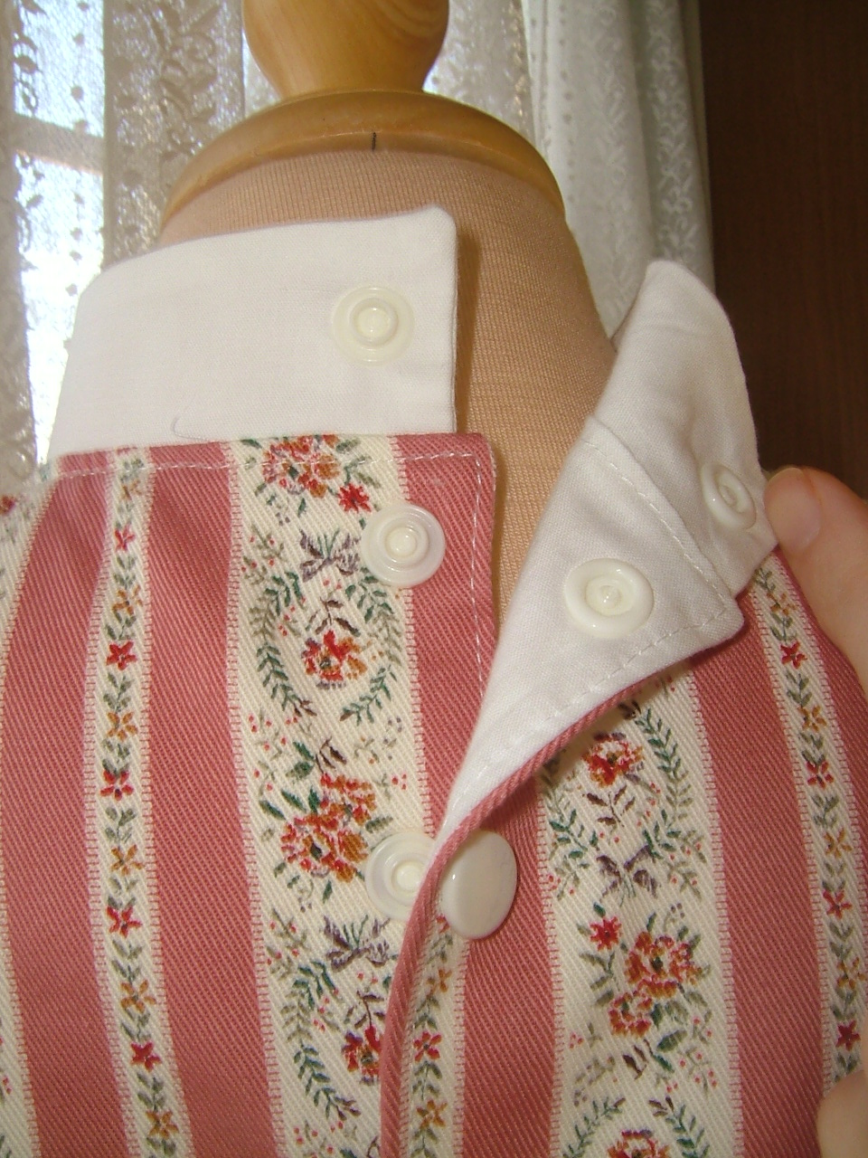 後ろです。プラスチックホックを付けてます。サイズはST5です。大きさは1cmぐらいです。付けるときに時間かからないので、ボタンつけるより簡単です。付け方は、カテゴリーの「服作成で必要なもの」に載ってます。